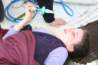 Ken and Trevor from St John's ambulance were awesome. Got her on the gas and gave her some other pain relief, splinted her leg and got her on board. The boys were excited about the ambulance and just wanted to sit in it. They were very content to climb up for 10 seconds then back down again. I travelled with Em, Nate stayed to sort out things at home. When we left Joesy took all the kids for a big walk and play at the playground and Mum cleaned up our house (thanks very much for that!).